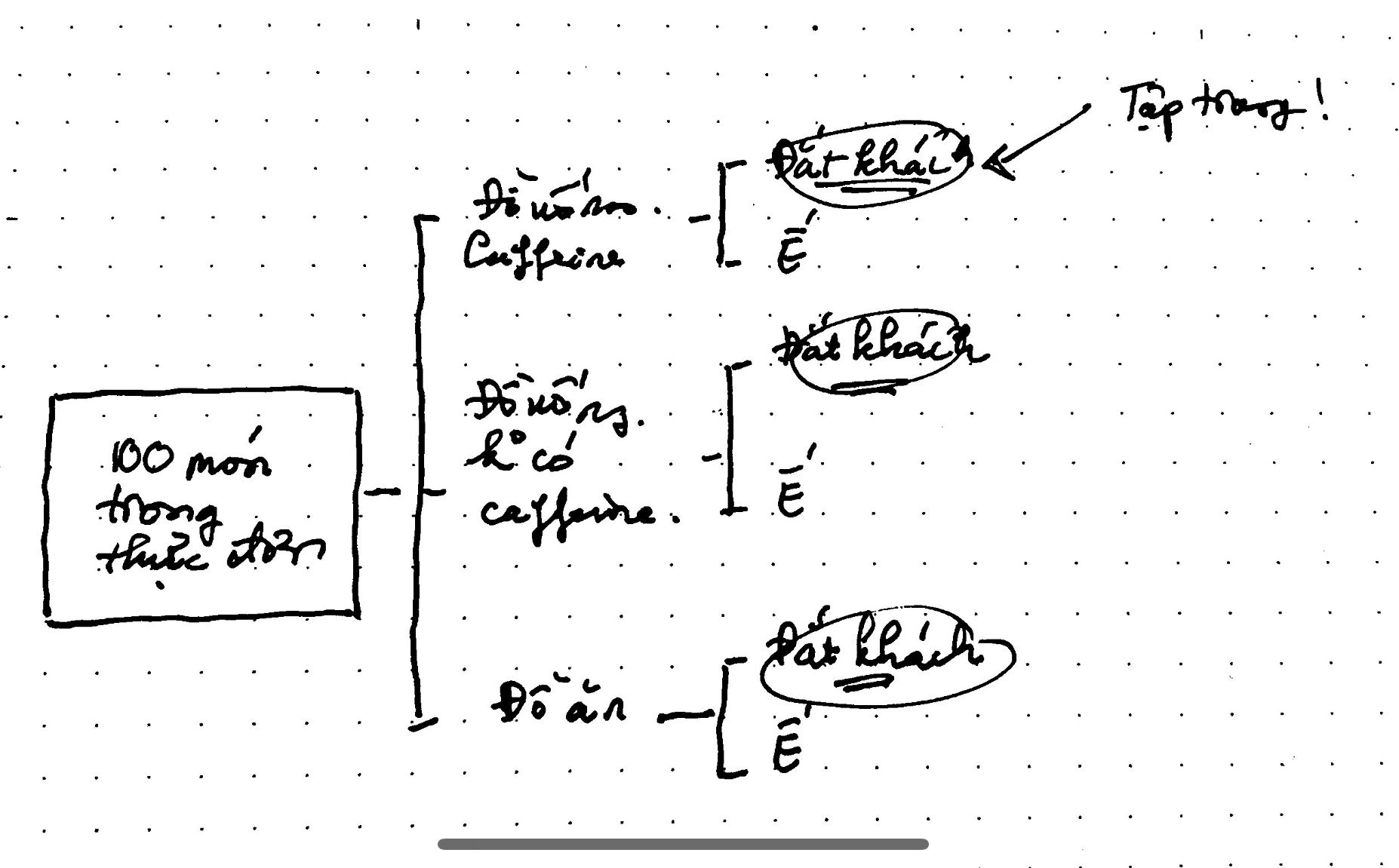 - Nhờ cách nhìn Từ-trên-xuống, tôi nhận ra mình cần ưu tiên trước các món đắt khách trong 3 nhóm chính. Nếu phân phối mức độ đắt khách của thực đơn cũng đi theo nguyên tắc 80:20, thì thật ra tôi chỉ cần học 20 trên tổng số 100 món, vì 80% số lần khách gọi đơn và doanh thu tập trung vào 20 món này. Đó cho tôi một khởi đầu tốt và ít dàn trải, để khi đã thuần thục 20 món rồi tôi sẽ có đà mà xông lên học các món tiếp theo