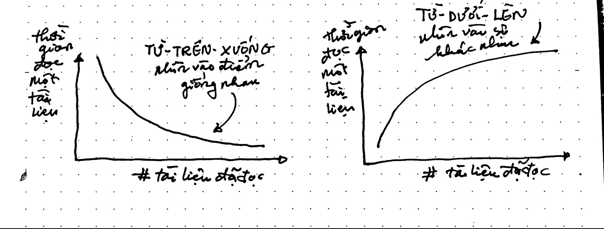 Hightôi đọc liên tiếp nhiều tài liệu, trong lượt đọc này tôi chỉ tập trung vào Sự giống nhau. Dù có mấy chục loại caffe thì chung quy chúng là sự kết hợp khác nhau của cà phê, sữa, nước theo các tỷ lệ khác nhau hoặc một vài loại phụ gia khác. Các giải pháp, các framework cũng vậy - Chúng sẽ có những cấu phần nào đó rất giống nhau về bản chất. Nhờ nhìn vào Sự giống nhau, tôi càng đọc nhiều thì sẽ càng đọc nhanh hơn, bởi cái nhau cộng hưởng, bồi đắp và lặp lại cái trước. Về cơ bản, tôi đọc lại cùng một số ý diễn đạt khác nhau trong nhiều tài liệu, nên càng đọc càng nắm ý nhanh (Như tôi vẽ ra đồ thị minh hoạ bên tay trái). - Đọc Từ-trên-xuống: Tôi lại đọc một lần nữa nhìn vào sự khác biệt và suy nghĩ vì sao lại khác biệt. Thông thường sự khác biệt trong giải pháp tiếp cận đến từ các yếu tố hoàn cảnh, chính một hoàn cảnh cụ thể khiến không bao giờ có hai giải pháp giống nhau, dù về bản chất chúng giống nhau hơn ta tưởng - đều được chi phối bởi một nguyên tắc tổng thể (Universal law). Nếu ta không có bước (3) để trang bị cho mình một nguyên tắc tổng thể nhằm xâu chuỗi và hệ thống vấn đề, ta sẽ lạc lối trong sự khác biệt. Như bạn thấy ở đồ thị bên tay phải, khi nhìn vào sự khác biệt, về cơ bản não ta cố nhớ trong đầu những điểm khác nhau, và càng đọc nhiều số lượng thông tin (về khác biệt) lại càng tăng lên và ồn ào trong đầu ta.