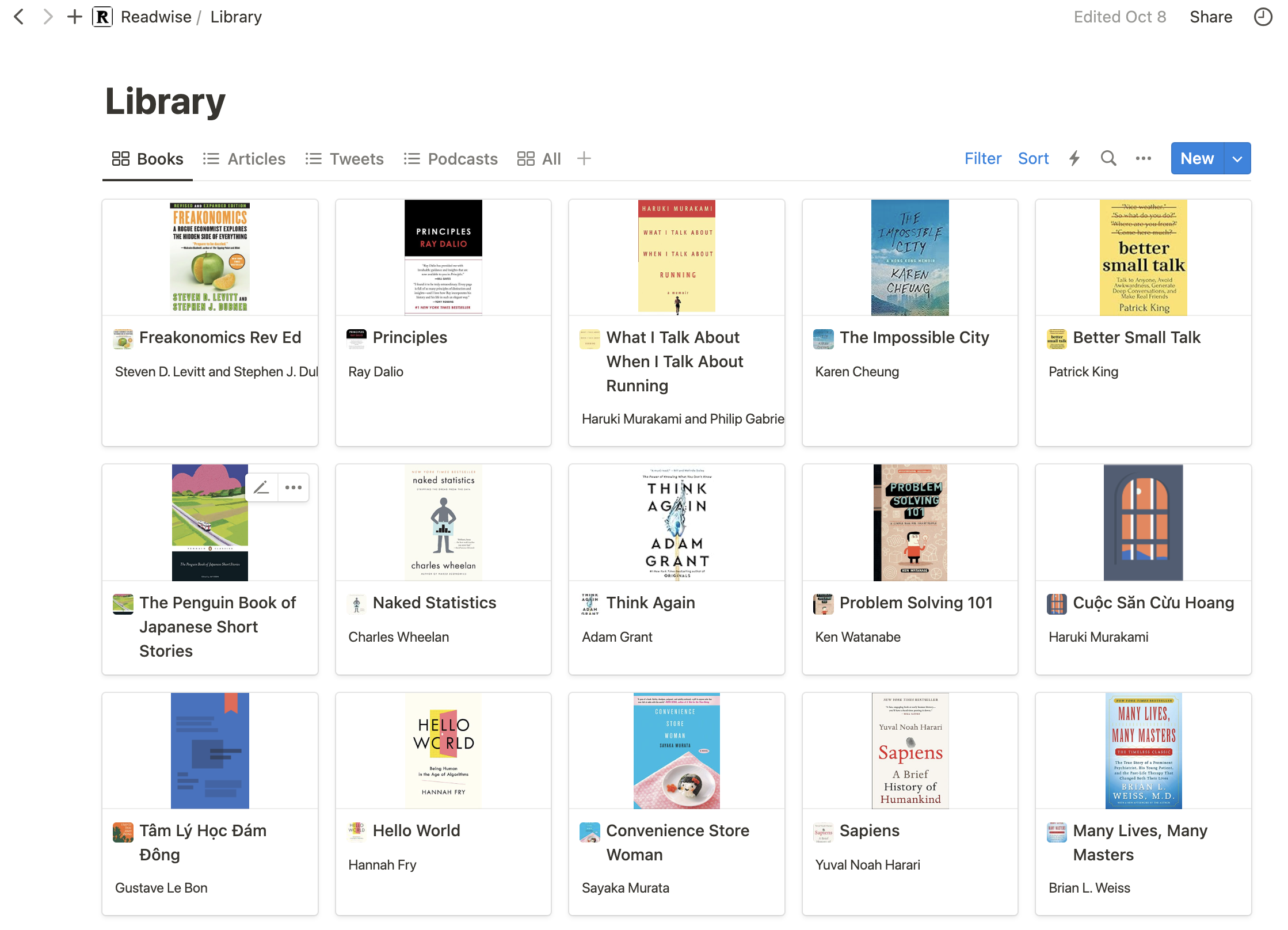 - Notion: Một nguồn quan trọng khác là các highlights và notes trong quá trình đọc. Kindle, Instapaper (web article) và Medium tự động gom về Readwise và connect với Notion. Mình dùng Notion cho mục đích này vì hệ thống database, views và tính năng chia sẻ của ứng dụng này rất phù hợp cho việc lưu các highlights