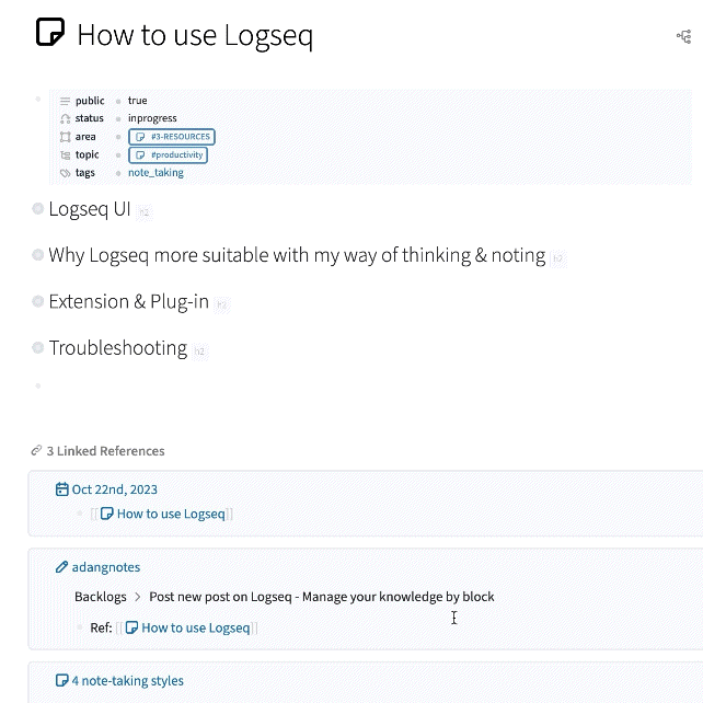Các Note trong Logseq thể hiện ở dạng Outline (Dàn ý) chứ không phải văn bản gồm các đoạn văn, mỗi ý là một gạch đầu dòng, với các ý nhỏ hơn bên dưới để bổ trợ ý trên.